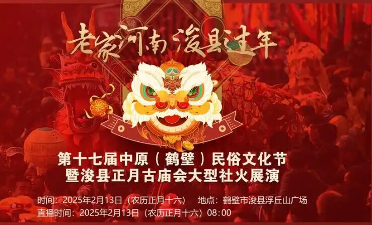 第十七届中原(鹤壁)民俗文化节是由鹤壁市人民政府主办,于2025年1月15日至2月13日在河南省鹤壁市盛大举行的一场文化盛宴。活动以“老家河南·浚县过年”为主题,旨在借助春节申遗成功的契机,围绕“春节、年味、民俗”主线,精心策划一系列特色活动,全方位展现中原地区深厚的民俗文化底蕴。