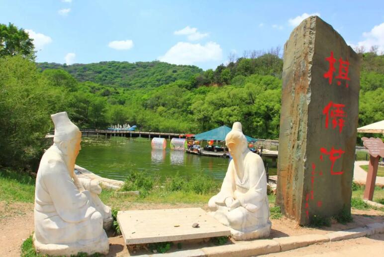 棋盘山山顶南侧有一个巨大的石棋盘,下侧刻有“星落石枰”字样。这块古老的棋盘石也是棋盘山的起源的名字。传说在一次神仙聚会后,铁拐李和吕洞宾一起返回,并越过了一座奇怪的山在山顶上,有一块看起来像棋盘的光滑的大石头。二仙突然想下棋,赌铁拐李 的葫芦经过几十回合的战斗,吕洞宾赢了,两位神仙笑着离开了。所以你可以看到门口的雕塑,葫芦放在吕洞宾后面。清代盛京著名学者苗公恩曾在他的诗中写道:杨珊岸边有一块大石头,又平又宽,据说是仙女棋盘。
