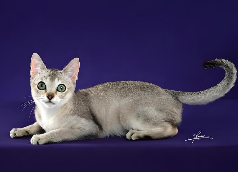 新加坡猫体长约30.5厘米,体重约2.3-3.6公斤。外观与美洲狮相似。它肌肉发达,身材苗条,耳朵和眼睛都很大。额头中央有明显的“M”形条纹。新加坡猫的皮毛有多层颜色,底色是古象牙色,上面还有深棕色的斑点。发梢发暗,形成类似刺鼠的条纹。新加坡猫精力充沛,外向,好奇,聪明,粘人。