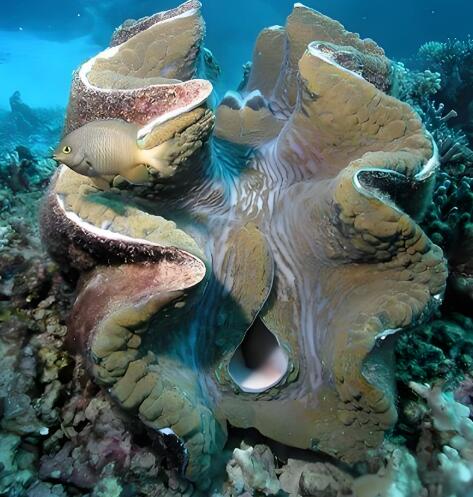共生关系:番红砗磲外套膜中有共生的虫黄藻,不同种类的虫黄藻含有不同的色素,这使得番红砗磲外套膜具有蓝色、棕色和绿色等鲜艳的颜色。虫黄藻可以在番红砗磲蝎子外套膜提供的空间、光照和代谢氮、磷和二氧化碳的帮助下繁殖。然而,番红砗磲不仅可以通过虫黄藻的光合作用获得营养物质,还可以通过吞噬细胞对虫黄藻的细胞内消化获得营养物质。