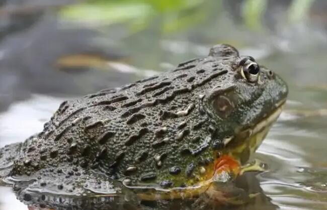 牛蛙体型与一般蛙相同,但个体较大,雌蛙体长20厘米,雄蛙体长18厘米,最大个体可达2公斤以上。皮肤光滑、坚韧、湿润,充满腺体。除了头前部和眼睛,身体表面的其余部分都覆盖着粘液腺,粘液腺分泌粘液并用于湿润皮肤以促进呼吸。牛蛙的体色与栖息地相适应,也随年龄的老幼而变化。普通的牛蛙是黄褐色或绿色的。如果你生活在一个明亮的地方,青蛙的体表是黄绿色的,带有亮点。生活在黑暗的地方或营养不良,青蛙体表的黑斑和斑纹不明显,从头部到肛门的背部有深褐色斑点,四肢有深褐色斑纹,灰白色腹部混合有深褐色或深黑色斑点和斑纹,但不如四条明显。雌性青蛙的喉咙是白色的,带有深灰色的斑纹,而雄性青蛙的喉咙是黄色的。在繁殖季节,它们喉咙里的色素特别鲜艳。
