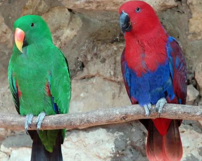 不拘一格的鹦鹉采用“一妻多夫”或“一夫多妻”制度,具有独特的性二色性形式,雌性羽毛为红色和蓝色,雄性羽毛为绿色。为了吸引配偶,雌性可能会坐在腹部的开口处,露出鲜红的羽毛。