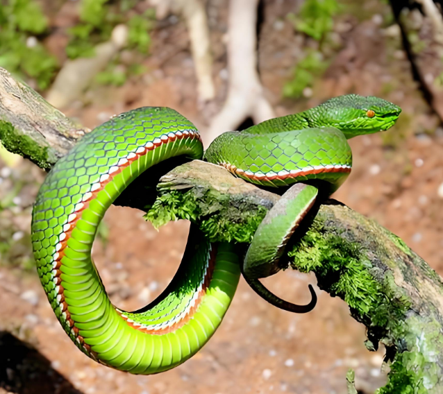云南竹叶青蛇(Bambusa yunnanensis),蝰科、斑竹Bambusa bambusa是一种蛇,最大成年体长约1m,体型中等。头部呈三角形,有明显的接吻边缘;头和背是绿色的,上唇略淡,眼睛是橙色的;背部绿色,腹部略显苍白,背部和尾巴尖呈烧红色,身体两侧各有白色条纹、淡黄(雌性)或红白各半(雄性)的纵纹。