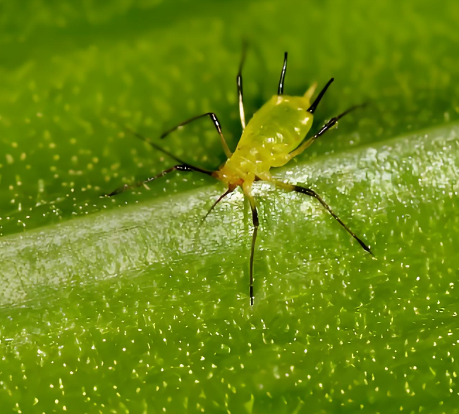 蚜虫体长0.5~7.5毫米,大多为1英寸.0~4.0mm。昆虫身体柔软,多呈椭圆形,有些种类呈纺锤形或扁圆形,体色多为绿色黄绿色黄绿色或黄白色、棕色和黑色,取决于类型、寄主、年龄等等。一般来说,以叶子为食的蚜虫大多是绿色的、黄绿色、黄色,一小部分是黄色和白色、褐色和黑色,生活在虫瘿中的蚜虫大多为浅绿色、乳白色、深绿色,而寄生在植物茎上的蚜虫大多为黄褐色、红褐色或土褐色,有些种类是黄色和白色。天线通常是6个节点,呈丝状,从最后一个节点的中间开始逐渐变细。口器是刺穿和吮吸的,可以用来吮吸植物的汁液。蚜虫可分为有翅型和无翅型有翼的个体有一只眼睛和两对翅膀:前翅大,后翅小,靠近前翅前缘处有一条由纵脉汇合而成的粗脉,末端有一翅痣;没有翅膀的个体没有一只眼睛。蚜虫的第六腹节背面有一对腹管,腹部末端有一个尾节。此外,一些蚜虫种类被蜡腺分泌的蜡粉或蜡丝覆盖。此外,蚜虫的触角、复眼、喙、足、翅、头发和头发序列蜡腺和蜡板、体瘤及突出物、腹管、尾片、尾板通常是用来区分物种的重要特征。