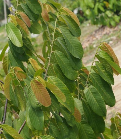 叶:叶近革质,长圆形或倒卵状长圆形,有时椭圆形,长6-17.5厘米,宽2-7.5 cm,顶部锐尖或圆形,有时略凹,叶无毛,叶背面被短柔毛;侧脉每边13-18条,倾斜,顶部平坦,底部凸起;叶柄长8-15毫米,青春期。