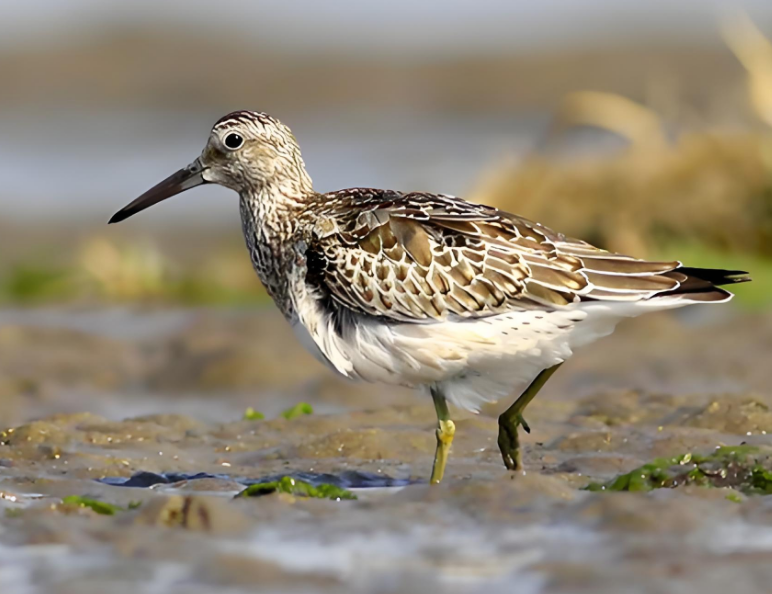 大滨鹬体长26-30厘米,重115-248克,翼展58-66厘米,是最大的滨鸟。头小,虹膜深褐色,嘴长而直,尖端略向下弯曲,呈黑色,基部浅绿色。繁殖期,头颈部有细小的黑色条纹,眉毛为白色但不清晰;胸部长出黑色条纹和斑点,形成胸带。背、肩部和翅膀上的羽毛呈棕黑色,肩部有栗红色斑块,翅膀下方主要为白色,腋窝处的羽毛为白色,略呈棕色;下体白色。非繁殖期,上身灰色,羽缘黄白色;胸部和侧腹有黑斑和纵条纹,胸部厚而厚。肩部呈深褐色,栗红色斑块消失;翅上覆羽、三等飞羽为浅棕色,羽缘黄白色,羽干纹黑色,有次端斑。脚四季都是灰绿色的。雌雄相似,幼鸟看起来像非繁殖期,但颜色较深,呈深褐色;上身有窄窄的光条纹;冠部为深棕色,胸部为浅黄色。