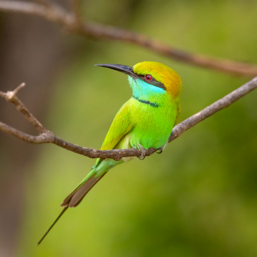 绿喉蜂虎(学名:Merops orientalis)是为佛法僧目蜂虎科蜂虎属一种鸟。体型较小,体长16~18厘米,体重15~20克。一年四季都覆盖着鲜艳的羽毛。身体大部分呈明亮的翠绿色,其中腹部最绿。绿喉蜂虎的虹膜呈朱红色,眼睛呈黑色图案,喉部周围有黑色条纹,喙长且略向下弯曲。有两条明显的黑色中央尾巴,长约6厘米。幼鸟颜色深,喉部和脸颊呈棕色,身体其余部分呈深绿色。黑色中央尾羽不变长变窄,尾部呈方形,没有喉下斑纹。