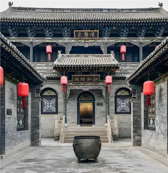新院—西方文化涌入:新院,又称为“四院”民国初年,乔主持修建了这座四合院。永路南的三院格局和北的不一样都是二元四边形主院是主人的住所,侧院是客房、佣人以及厨灶房。走进院子,院子里的砖雕“省分箴”字体浑圆苍劲,由著名书法家赵铁山书写,是不可多得的艺术瑰宝。省”是醒悟,“分”是分寸,“箴”是一种风格,意味着做人做事有分寸,懂得知足。砖雕顶部雕有蝙蝠,底部雕有流云,令人向往“万福流云”两边是暗八仙,上面是桃花,这是共识“八仙祝寿”下面雕刻的戟、磬、如意则寓意“吉庆如意”底部两侧是狮子滚动绣球,意思是“狮子滚绣球,好事随后”乔留学经历使她深受西方文化的影响。在建造新庭院时,除了延续传统文化,还打破固有思维,大胆创新,将西方文化融入其中门窗都装有圆顶过梁,宽敞明亮的玻璃,火车是、钟表等新事物融入建筑装饰。女儿 中间有一个香炉新院南屋顶s墙,上有太子,寓意香火不断,后继有人;院门左右翼墙上刻有“猫蝶秋菊”喜鹊登梅”的装饰。此外,新庭院还展示了一个杂货店、茶点、绸缎店、药店、珍宝行、当铺等曾经“辉煌”熙熙攘攘的晋商街道,以及商人的景象、坐商、度量衡、货币票证陈列。