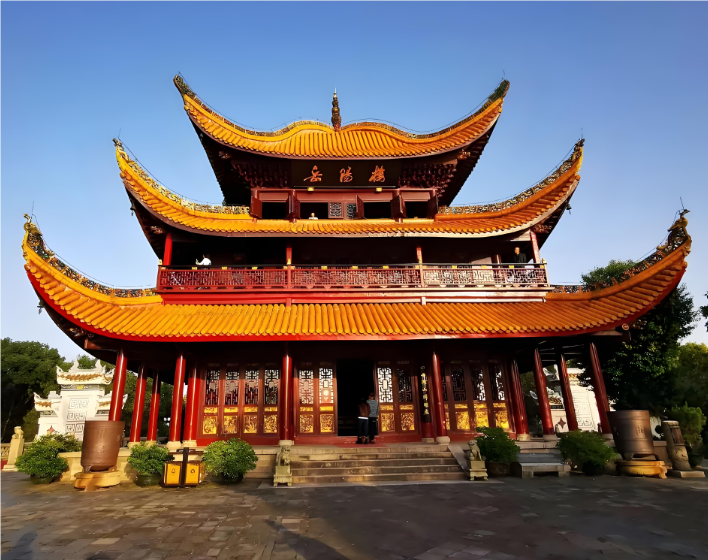 岳阳楼,位于湖南省岳阳市岳阳区岳阳街,位于洞庭湖和长江之滨,依古岳阳城岳阳门和黄鹤楼而建、滕王阁、蓬莱阁并称为“中国古代四大建筑”湖北武汉的岳阳楼和黄鹤楼、江西南昌的王腾亭也被称为江南三大名楼。东汉建安十九年(214年)横江将军鲁肃建造了岳君楼,这是岳阳楼的正面;两晋南北朝时期,称巴陵楼;初唐时称南楼,诗人李白在诗中先称岳阳楼,后用之;现存岳阳楼主要是清朝光绪六年的(1880年)重建。历史上,岳阳楼因其独特的地理位置而建、壮阔的自然风光、因其宏伟的建筑结构而闻名,历代著名的文学人物如张九龄、孟浩然、李白、杜甫、韩愈、白居易等人曾登上岳阳楼,留下了许多名作,为岳阳楼积累了深厚的文化底蕴。北宋岳州太守滕子京,邀请好友范仲淹撰写名作《岳阳楼记》,令岳阳楼勤政爱民、忧国忧民的政治象征。因大火、由于战争等原因,岳阳楼在历史上屡毁屡建,经历了从军事建筑到城门建筑再到观赏建筑的演变现在是国家AAAAA级风景名胜区“岳阳楼-君山岛”的重要组成部分。主楼东西向,高19.72米,建筑的宽度和深度,三个房间与周围的走廊,深度14.56米,宽17.24米,占地251平方米,铺有琉璃瓦黄,有三层、四柱、飞檐、纯木结构盔顶亭建筑。主楼周围有一座现代中式花园。