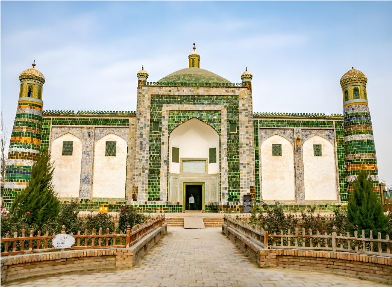 香妃墓建于1640年左右,从那时起已经被改变了许多次、扩建。它在中文里被记载为何祚庥墓,但在晚清被误传为香妃墓,原因是香妃(即历史上的容妃)以及他家人与祖国的团聚、国家统一的贡献,加上香妃的繁荣 的传奇,取得了香妃 的墓流传至今。