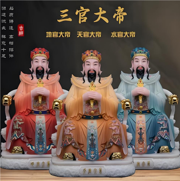三官大帝指的是天官、地方官和水官是道教最早崇拜的三个神,分别由天地水的自然崇拜人格化。因为道教把三官的生日定在三元日,所以也叫三元日“三元大帝”根据他们的主要职能,他们也被称为上元祝福天官、中元赦罪地官、下元解厄水官。