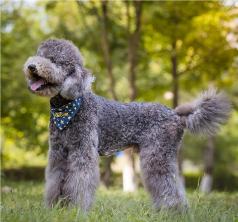 尾巴:巨型贵宾犬的尾根高且略倾斜。一般为了美观和卫生,往往会人为折断尾巴,占总尾巴的2/3。