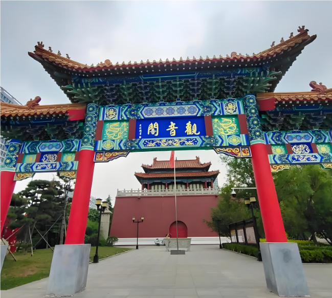观音阁,东西向,直立在长江的一块巨石上,龙蟠集,——展馆长24米,宽10米,高14米,底座厚1米多,服务长度60米、宽20、25厘米厚的石基。这座亭子是由红石和青砖建成的是典型的柯南泰楼阁式木石结构建筑,布局大体保持元代格局。阁身正壁镌有“观音阁”三个大字。亭子正门的门楣上刻有清代的官方手迹“龙蟠晓渡”四字。亭子建在一亭三厅二楼,总面积300多平方米,自西向东依次为观澜阁、东方朔殿、观音殿、老君殿和纯阳楼、迎宾楼,除了客厅、丹房、斋厨等。