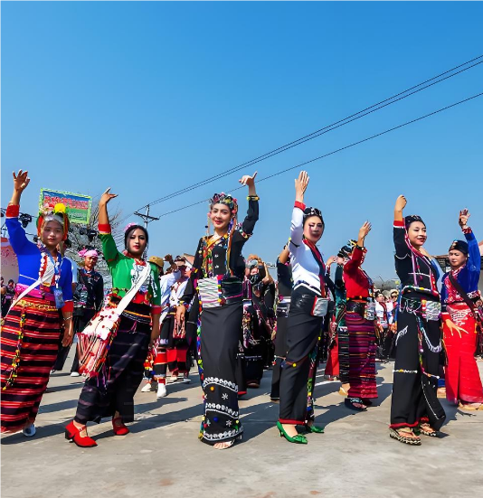 做摆:表演是一种伟大的致敬,这是德 昂人,一般在农历二月初二、三月份,在淡季的另一天举行。以村为单位,祈求本村百姓平安生活,消灾。演出前,村里提前准备了资金和食物,为远近其他寨子的参与者提供住宿。第一天是迎佛,第二天是拜佛佛祖会念《长拉尼亚经》,让大家年年有吃有喝,年年有钱。最后一天,客人走了,寨子里的人聚在一起,载歌载舞。