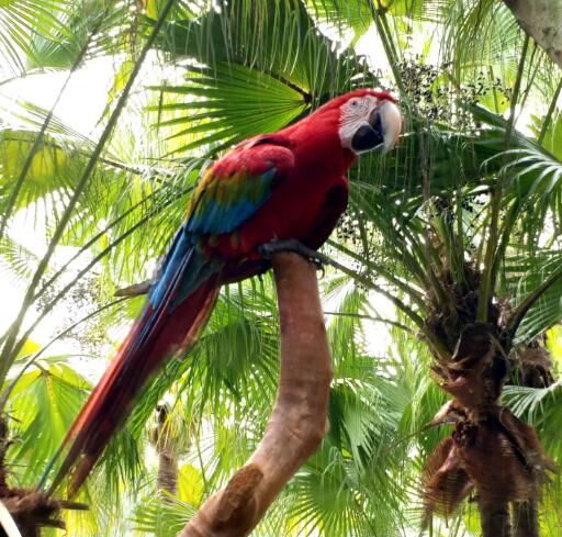 其中绯红金刚鹦鹉的分布范围最广。它头肩部为鲜红色,背羽的后半部为蓝色,两种颜色结合的部位是黄色。在同一种类中,又数它们的体型最大,重约1.4千克,体长约1米。