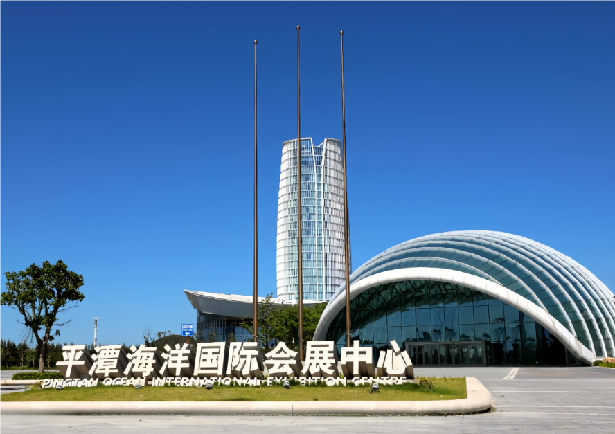 平潭海洋国际会展中心,坐落于平潭综合实验区君山片区,位于麒麟大道南侧和鹿原南路东侧,毗邻平潭高铁站,直线距离距平潭动车站仅一公里,曾作为中国篮球队奥运备战阶段性的训练基地使用,总投资约18亿元,总用地面积约13万3335平方米。其展览展示中心设有4 个展厅,西面3个单层展厅高度约21米,东面1个双层展厅高度约11米,每个展厅净面积约3600平方米,净展览总面积约1.9万平方米,室外展面积达 3万平米。