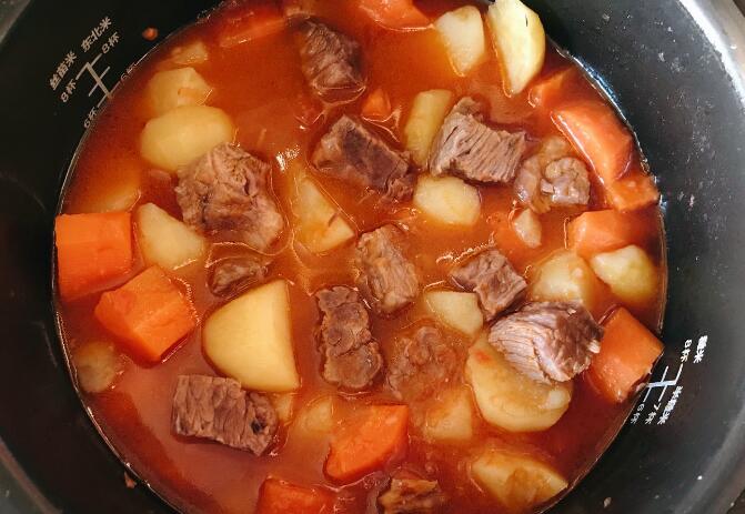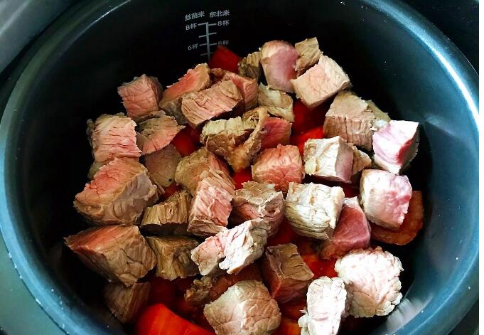 3、炖煮一个半小时以后,打开电饭煲,此时的牛肉已经软烂鲜香了,尝一尝咸味,看是否需要补充咸味,其它调味品不用放。