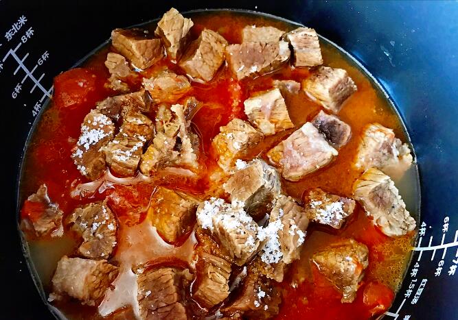 2、准备一个电饭煲或者砂锅,最底部放洋葱,接着放番茄,最上面放牛肉块,加入足量的开水,舀入适量的食盐。
