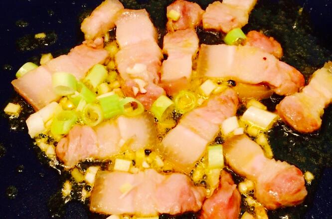 1、准备一块带皮五花肉,肥瘦均匀,改刀切成片,起锅烧油,油热放入葱姜末,爆出香味。