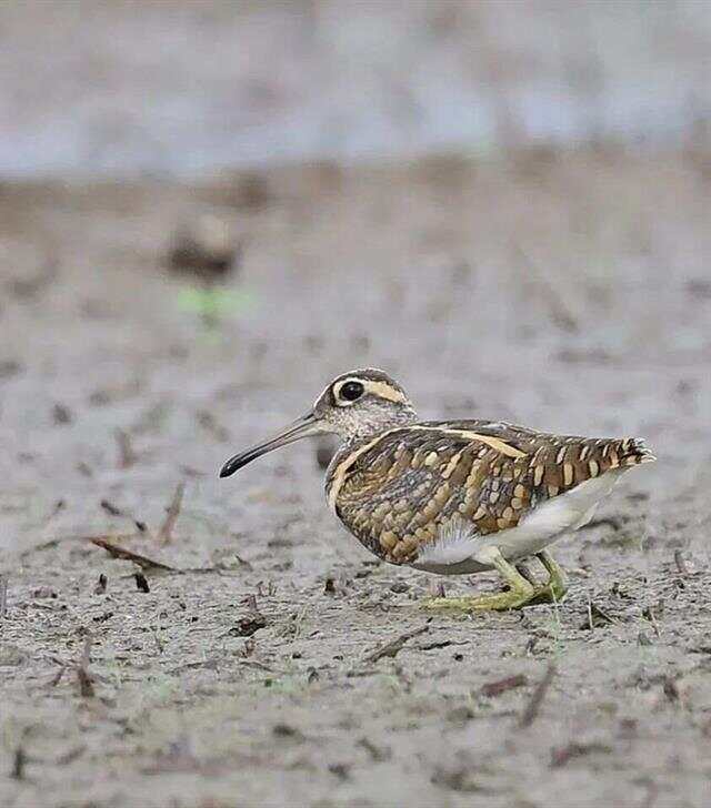 彩鹬,学名Rostratula benghalensis,亦称作水画眉或水札子,属于彩鹬科彩鹬属的中型鸻鹬类。它们的体重通常介于120至190克之间,体长则在220至270毫米。这种鸟类特征为圆头短尾,雌鸟的眼后有着带柄的白色眼镜纹,颈部、喉部以及前胸呈栗色,背部两侧有金黄色的纵向条纹。雄鸟体型略小,颜色相对较雌鸟更为暗淡,眼周条纹为皮黄色,背部和两翼则呈现黄褐色的杂斑。