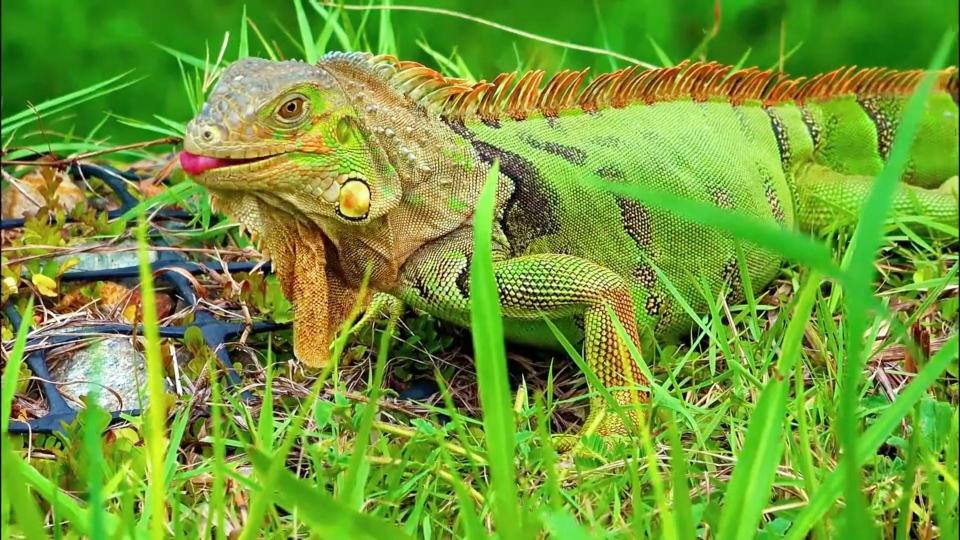 绿鬣蜥,学名Iguana iguana,属于美洲鬣蜥科美洲鬣蜥属的爬行动物。作为美洲体型最大的蜥蜴之一,绿鬣蜥体型细长,平均长度可达1.98米,雄性个体最长可超过2米;其尾巴长度远超头和身体总和,有时甚至达到头体长的两倍;平均体重约为4.99千克,雄性个体体重最大可超过6千克,而雌性个体体重约为雄性的一半。幼年时期的绿鬣蜥全身呈现鲜艳的绿色,成年后主体颜色仍为绿色。它们拥有大眼睛,头部背中线眼眶处有一只顶眼,这是一种光感觉器官。耳部下方有圆形的大鳞片,喉部有发达的喉囊,成年雄性的喉囊比雌性更为发达。它们的躯干上有时可见不明显的不规则斑纹,尾巴上则带有黑色间断的条纹;成体从背部到尾部有一排梳状鼠鳞。