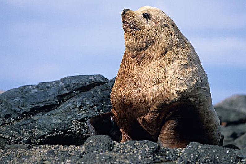 北海狮的毛被短而密,仅鳍肢末端无毛。毛色为黄褐色,背部颜色较浅,胸部和腹部颜色较深,鳍肢则为鲜明的黑色。值得注意的是,当北海狮身体潮湿时,其体色会变淡,呈现出灰白色。成年雄狮具有与雌狮和幼狮明显不同的特征,它们的前额因头骨矢状脊的发育而突出,颈部和肩部长有浓密而粗的鬃毛。