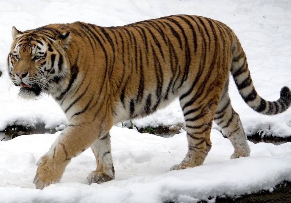 东北虎,亦称西伯利亚虎、乌苏里虎等,是现存最大的虎亚种之一。其背侧体色为橘黄色,带有黑色条纹,腹面则为白色。冬季时,东北虎的毛长且蓬松,显得非常粗壮。成年雄性东北虎平均体重约为250千克,头体长约为2.3米;成年母虎的平均体重约为170千克,体长约2米,肩高约1.1米,尾长约1.3米。最大身长可达2.9米(含尾长)。