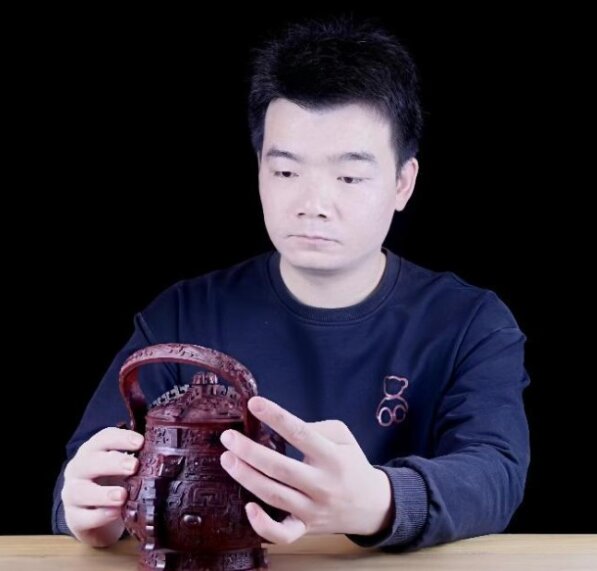 龙巍,自2005年从师学艺至今,一直致力于祁东木雕传统瑞兽雕刻技艺,秉承着业精于勤荒于嬉,多年来不断思考,在祁东木雕传统瑞兽基础上持续创新,在木雕仿古青铜器型上青铜化木,走出了自己的一条路,在青铜器的形和纹饰上结合祁东木雕精、细、奇、巧的特点创作出了一系列器皿类作品,受到了很多藏家的喜爱。在木雕的艺术创作上,熟练掌握了木雕的各种雕刻技法,浅浮雕、深浮雕、透雕、圆雕等雕刻技法皆能应用自如。对于木雕在刀法上的运用深有领悟,雕刻刀法好比书法、绘画中的笔触,它能起到加强、丰富作品艺术效果的作用。刀法就是雕刻家用来体现自己创作构思的技术手法,也是形象地揭示艺术内容的手段。运刀的转折、顿挫、凹凸、起伏,都是为了使作品更加生动自然,以充分体现木雕的材质美,体现内涵丰富的精雕细琢之美。在选材用料上,偏爱海南黄花梨和印度小叶紫檀,因其生长缓慢,数量稀少,数百年才能成材,木质坚硬,纹理优美,香味浓郁,是一种非常名贵的木材。但是,大口径的天然造型的海南黄花梨、印度小叶紫檀更是罕见,每当遇到,十分珍惜,不会轻易动手雕刻,总是尽可能根据原料的天然外形,反复构思,精心设计,在注重艺术表现力同时,通过巧妙造型,追求完美的创作理念。