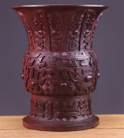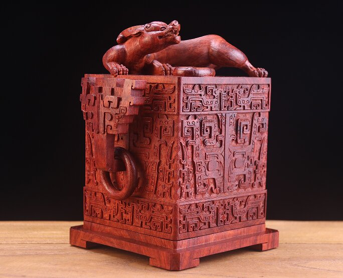 创作设计:尊,在古代多为青铜制,主要用于盛装美酒,也是中国古代青铜器的重要器皿之一,也是古代王公贵族所拥有的,象征着其地位的尊贵,也是古代祭司时所用的重要礼器,特别受古人尊重,因此“尊”字又引用出尊重、尊贵、尊敬等由尊而起的词,并沿袭至今。今用小叶紫檀,青铜化木制器,致敬古代匠人超高的技术水平和匠人精神。作品选用上好的小叶紫檀一木成器,在商周青铜纹饰的基础上结合现代手工刀具使其纹饰更具立体感,纹理更加细腻整洁。然因是木制,虽不具备盛装美酒,亦可当做笔筒使用,既是一件艺术品摆件,也是一件极具美感的实用器。
