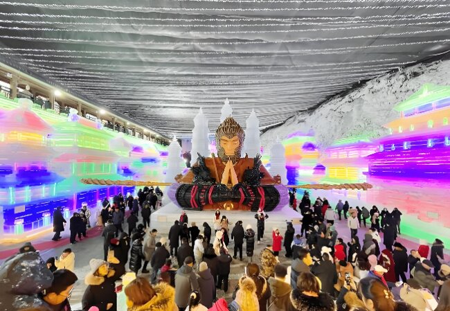 作为嘉年华的核心区域,冰灯艺术区占地面积8000平方米。这里展示了350件冰灯作品、240件冰雕作品和80件雪雕作品,每一件都堪称艺术精品。在传统冰灯艺术的基础上,这些作品巧妙地融合了泡泡玛特、西游、仙侠等热门IP元素,划分出蛇年贺新春区、泡泡玛特区、西游文化区、仙侠文化区、冰川飞瀑区等多个特色区域。Q萌可爱的泡泡玛特形象、奇幻神秘的西游仙侠角色,以独特的艺术形式呈现在冰雕、雪雕之上,营造出浓厚的节日氛围,让游客在欣赏冰灯艺术的同时,也能感受到热门IP的独特魅力。