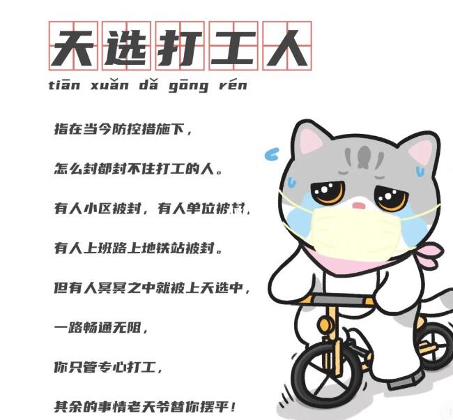 2022年5月5日是五一假期后上班第一天,热词“天选打工人”在微信朋友圈里刷屏,“我是天选打工人”“天选打工人完成7轮核酸检测已到岗”,辅之以或写实或写意的图片。网友公认“今天小区没封+单位没封+健康宝没弹窗=天选打工人”。