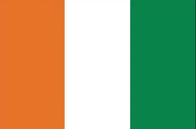 科特迪瓦国旗采用于1959年,并于1960年8月7日独立时启用。国旗呈长方形,长与宽之比为3:2。旗面由三个平行相等的竖长方形构成,从左至右依次为橙、白、绿三色。橙色代表北部的热带大草原,也象征国家的繁荣富强与人民的爱国精神;白色象征南、北方的和平团结的希望;绿色代表南部地区的原始森林中丰富的自然资源。橙、白、绿三色还分别解释为:民族爱国精神、和平与纯洁、对未来的希望。