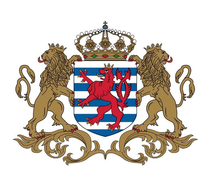 卢森堡国徽分为大中小三种,中心图案为一盾徽,绘有白蓝相间的十条横条,中间为一只头戴金冠、呈愤怒状的红色狮子。上有大公冠冕。中间部分有两只狮子守护盾徽。大国徽为中间国徽加上斗蓬,上方有大公冠,下饰勋章。大国徽为斗篷式。在顶部有一金色王冠的金、红、白三色斗篷内,有一枚盾徽。盾面由白、蓝相间的平行条纹组成,其上绘有一只头戴王冠的直立着的红狮,红、白、蓝三色为国旗颜色。盾徽上方有一顶公爵金冠,两侧各有一只金狮,周围饰有绶带,下端悬垂着一枚奥康勋章。国徽图案象征卢森堡是一个大公国。