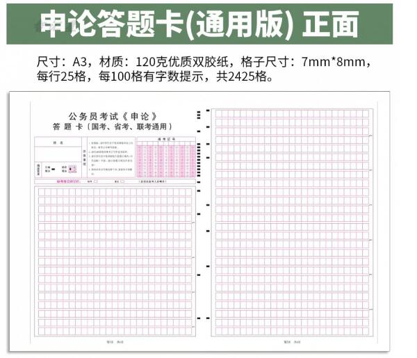 申论答题卡是国家公务员考试申论科目使用的答题卡为A3幅面100120g双面胶纸,网格尺寸一般为8*8mm,大约25个正方形的线。答案做完后,用扫描仪扫描成图片文件,再用手工电脑批改。由于纸张特殊,书写效果与平时纸张不同建议买练习卡,用于申请和答题。