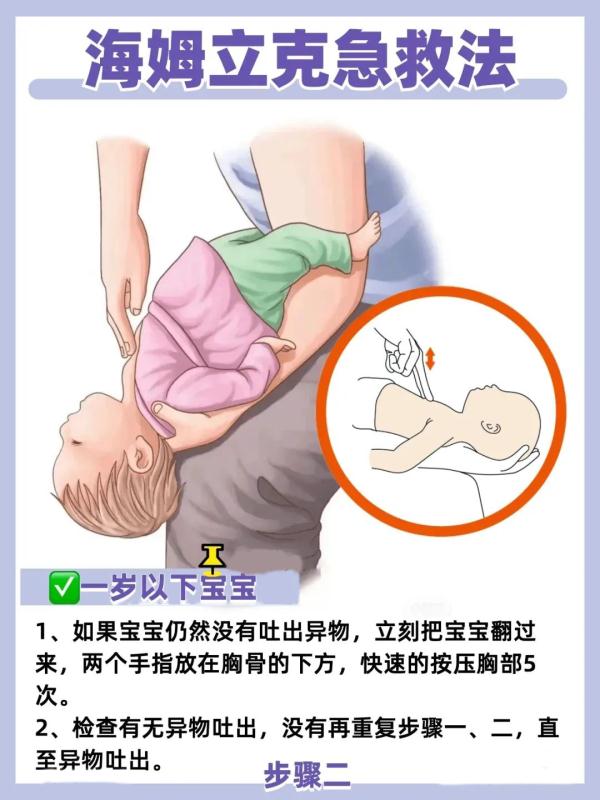 首先,施救者一只手固定住患儿头部,将其面部朝下,保持头低脚高,用另一只手掌根部连续叩击肩胛骨连线中点处5次。然后,将患儿翻转成面部朝上,保持头低脚高,检查有无异物排出;如未发现异物,立即用中指和食指按压患儿两乳头连线中点处5次。反复交替操作上述两个步骤,直到异物排出。