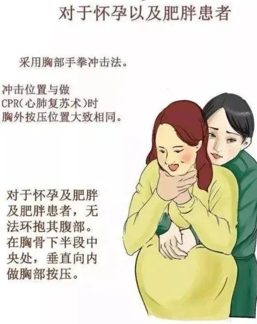 让患者站立,施救者站在患者身后,双臂环抱患者胸部,一只手握拳,拳眼置于胸骨下半部分,另一只手包住拳头,然后连续、快速、用力向患者的胸部后方冲击,直到异物排出。