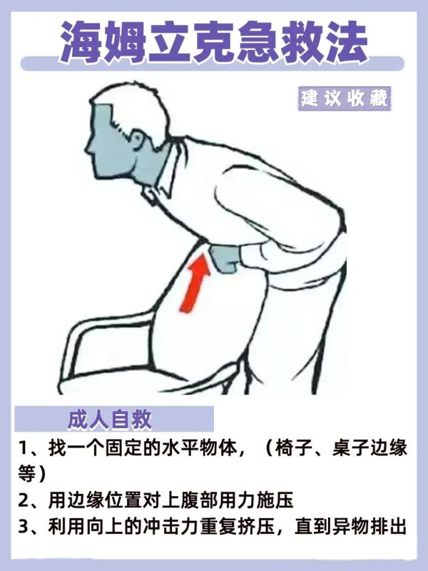 患者可进行自救,一只手握拳,拳眼置于脐上两横指上方,另一只手包住拳头,双手急速冲击性地、向内上方压迫自己的腹部,反复有节奏、有力地进行。或稍稍弯下腰,靠在一固定物体上(如桌子边缘、椅背、扶手栏杆等),用物体边缘压迫自己的上腹部,快速向上冲击,重复进行上述操作,直至异物排出。