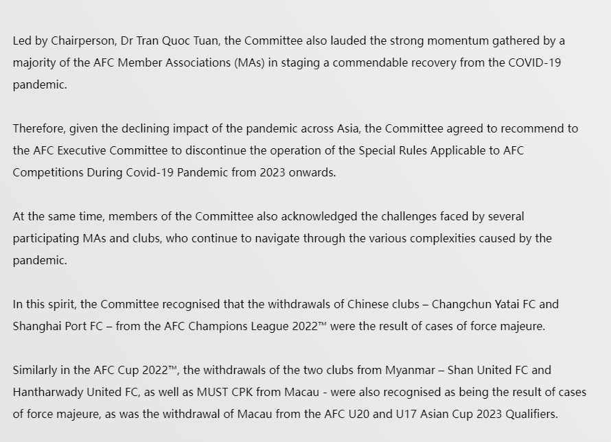 不过对于中超球队上海海港和长春亚泰,退出2022赛季的亚冠,亚足联表示是因为不可抗力因素所导致,将不会针对这2支球队进行处罚。