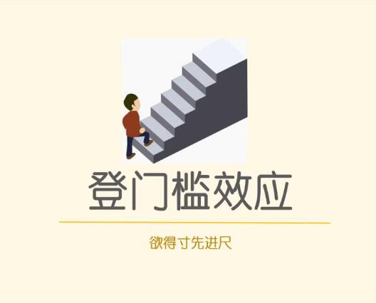心理学家认为,在一般情况下,人们都不愿接受较高较难的要求,因为它费时费力又难以成功,相反,人们却乐于接受较小的、较易完成的要求,在实现了较小的要求后,人们才慢慢地接受较大的要求,这就是“登门坎效应”对人的影响。明代洪自诚也曾谈到这个问题,他在《菜根谭》中说:“攻人之恶勿太严,要思其堪受;教人之善勿太高,当使人可从。