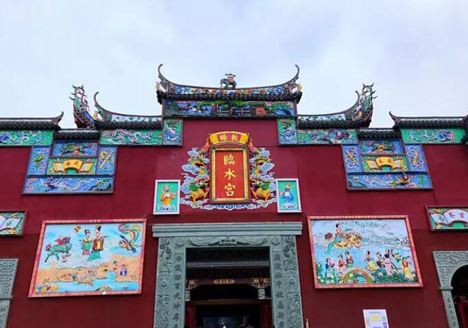 临水宫大门位于正殿东南,分为两路,仪器门在前,门楼在后。仪门为门楼,有五个拱形屋顶,上侧中央有一个凹雕“敕赐临水宫”一块长方形竖匾,上面写着 quot龙腾虎跃quot左右浮雕、天官为装饰。墙体为五花山墙,支撑三层屋顶,上中层为歇山顶,下层为双波浪形屋顶,自下而上铺瓦。正脊是弯曲的,两端是“燕尾脊”仪门左右各有一对青石抱鼓石,是明代成化二十年后的(1484年)间打造。门楼位于仪门,顶部分为三层上层是斜顶山,两脊一双尾。中间是半歇山顶,两端的山脊和尾巴向外倾斜“崇祀典”广恩波”字样。下层为双波顶。三层分别饰有不同的浮雕。