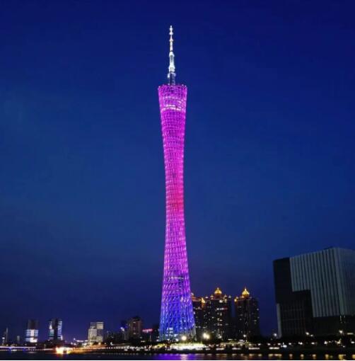 广州塔 的夜景照明设计是将7000多组RGB LED投射灯固定在钢架管内部,并通过使用圆点、线、面对面处理,辅以灯光色彩、灯光运动、光影变化等动静结合的灯光,表现出电视塔的外轮廓和钢框筒的质感效果,使电视塔栩栩如生、活跃、活泼的个性特征。作为第16届亚运会的背景建筑,其灯光效果令人印象深刻。