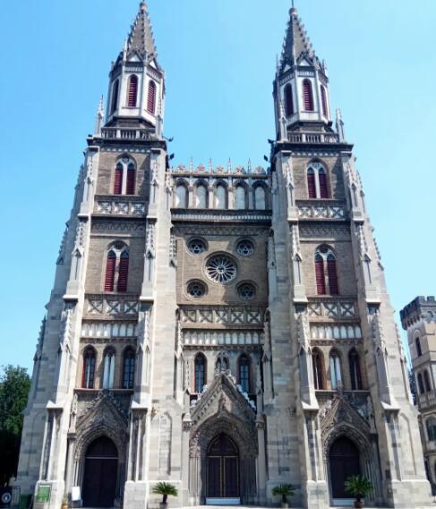 中厅一楼和中塔各有一个尖尖的拱形检票口中间的正门刻有花卉浮雕,两侧摆放有龙头雕像的壁龛门票用精美的砖雕雕刻而成。二楼有三个并列的尖拱形券窗,将竖向立面分成三部分,符合天主教“三位一体”的信条。中央大厅三楼有五个圆窗,在中央大厅山墙的四个角上有四个小圆窗围着中间的大圆窗大圆窗直径约10米,由16个花饰组成圆窗是轮窗的形状,这是早期哥特式建筑的特点。另一方面,两侧钟楼三楼开有一个大的尖角券窗。中央大厅四楼有五个大小相同的尖尖的假券窗,两侧钟楼四楼有一个尖尖的券形百叶窗。钟楼的第五层是一个高耸的八角形塔楼,两侧各有一个尖尖的拱形百叶窗。