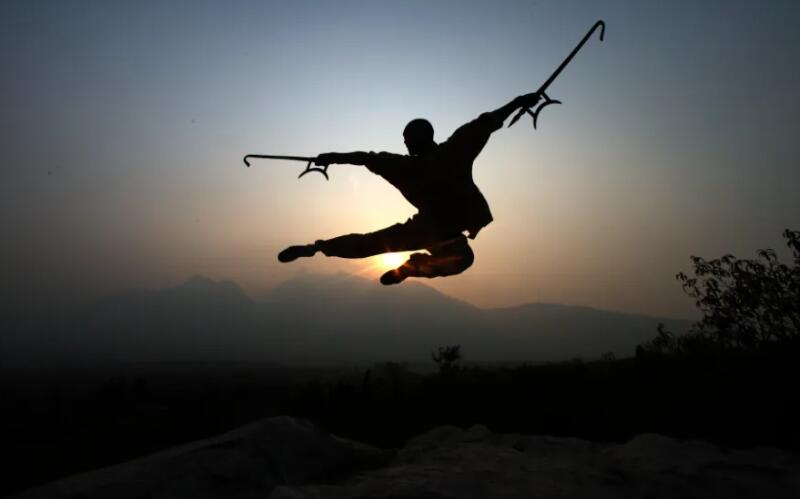 取意:两臂抬起,掌上持拳,拳尖上挑,拳心朝上成双成对;出拳时左腿上提,右脚前跨与肩同宽同高。两手肘关节要屈伸开,两手掌心要有弧度;提至胸前的同时两臂举直成弓步,拳尖向上成顶天立地的姿势;落招时左腿上提时回左腿收进,左腿屈膝挺胸、左拳前顶,右腿屈膝收进,左脚朝前踢出时左脚向后蹬出,同时左手也向前蹬出一手右手向后挥出。