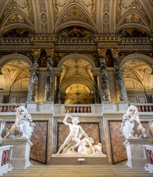 博物馆的楼梯间里有意大利雕塑家安东尼奥·卡诺瓦 s工程《忒修斯群像》(Theseusgruppe)穹顶上有匈牙利画家米哈伊尔·蒙卡奇 天顶画《文艺复兴的赞歌》(The Renaissance),还有汉斯·Markat s画的半月形窗户,下方三角拱肩处的壁画是奥地利画家弗朗茨·马什及古斯塔夫·克里姆特 s精品,楼梯间的装饰画是Klimt,《古埃及时代》,《古希腊时代》画的。
