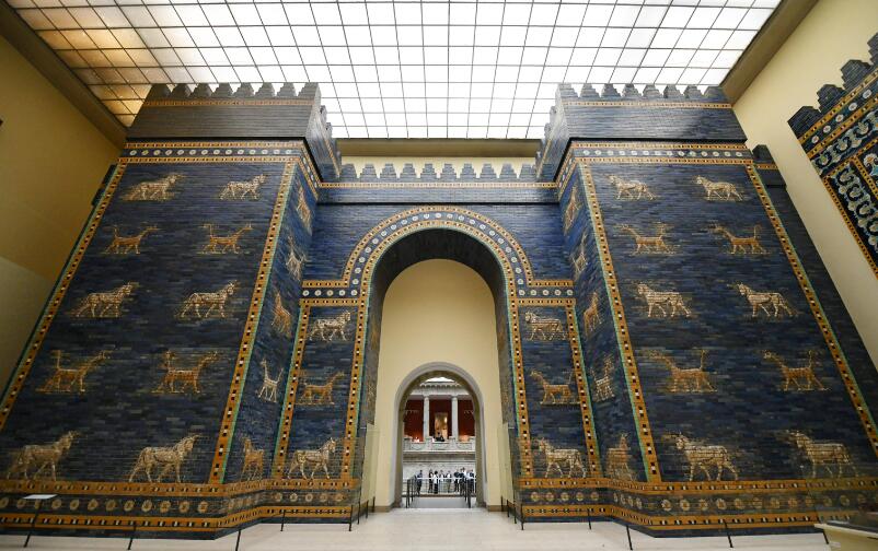 伊斯塔门收藏在古代近东博物馆。该门建于尼布甲尼撒二世统治时期(从公元前604年到公元前562年)这是曾经通往巴比伦的八道门之一。20世纪初,德国人在伊拉克考古过程中挖掘出城门的碎片,运回德国,在伊拉克斯塔尔恢复重建城门。斯塔尔之门建成时有12米高,瞭望塔将近30米高。在每个瞭望塔的墙上,都有一个缺口,叫做炮门垛。大门上覆盖着蓝色琉璃瓦,上面用黄色白色和棕色雕刻着古代宗教中的动物,如公牛狮子和龙,象征着古巴比伦的古代神灵。