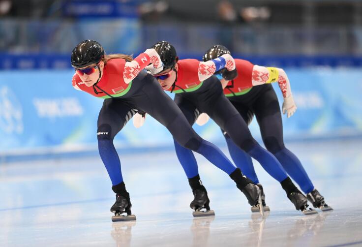4.一号运动员领先跑第一圈,随后是队里的其他运动员。每跑完一圈,领先的选手必须离开跑道外侧,下一位选手将领先下一圈。最后指定的运动员将独自滑最后一圈,代表队伍完成比赛。