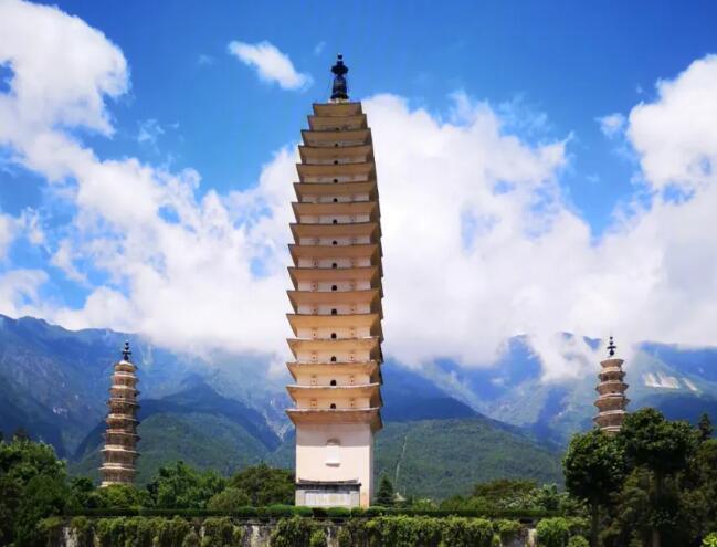 崇圣寺的三塔造型优美,千寻塔造型优美独特,与两座小塔组合排列“品”话,主次分明,但整体统一。从远处看,对比鲜明,在造型上相互映衬、和谐协调。