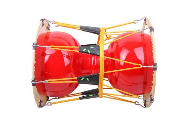左右鼓面缝在直径约41~48 cm的两个铁圈上,分别盖在左右两端的鼓口上铁环周围分别安装八个铁钩橡胶条或鼓绳,相邻两绳之间放一个可调节的活动皮套,以调节鼓面的张力皮套也叫浮动旋转。鼓体外表面涂有红漆,并绘有金色图案作为装饰;鼓槌长约40厘米,由细竹条制成,杵头略大。