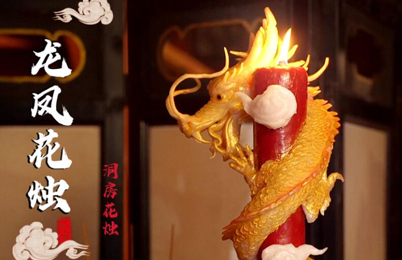 一种婚礼龙凤花烛的制作方法,由碎竹组成、缠芯、熔蜡、上软石蜡蜡油、硬石蜡蜡油、上色、预备花烛蜡油、制作龙烛、凤烛、完成十个主要挖掘程序 。复杂的步骤使得蜡烛燃烧时间长,燃烧时能自然形成巢状顶部,保证燃烧时蜡油不会流出。