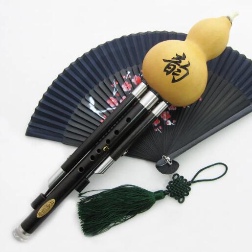 葫芦丝造型别致,整体看起来很吉祥“吉”字,俗称三管葫芦丝,主要由一个完整的天然葫芦组成、由三根竹筒和三根金属簧片组成,总长约30厘米。将一根竹筒插入葫芦的柄端作为吹口葫芦既是盛气的风箱,又是美化音色的音箱通常,颜色是黄色的、成熟的葫芦,皮厚而结实,底部插着三根粗细不一的竹筒;三竹筒一般是用密密麻麻的紫竹做的中间的主管又粗又长,有七个音孔,上面有六个背可以安装一个簧片来吹出从G1到G2的八度音程的旋律。左右两侧附管略细稍短,无音孔,各配一个簧片通常,左边头发上的附属管道“e2”音,右边附管发“a1”声音或寂静,与主管产生共鸣的和弦。